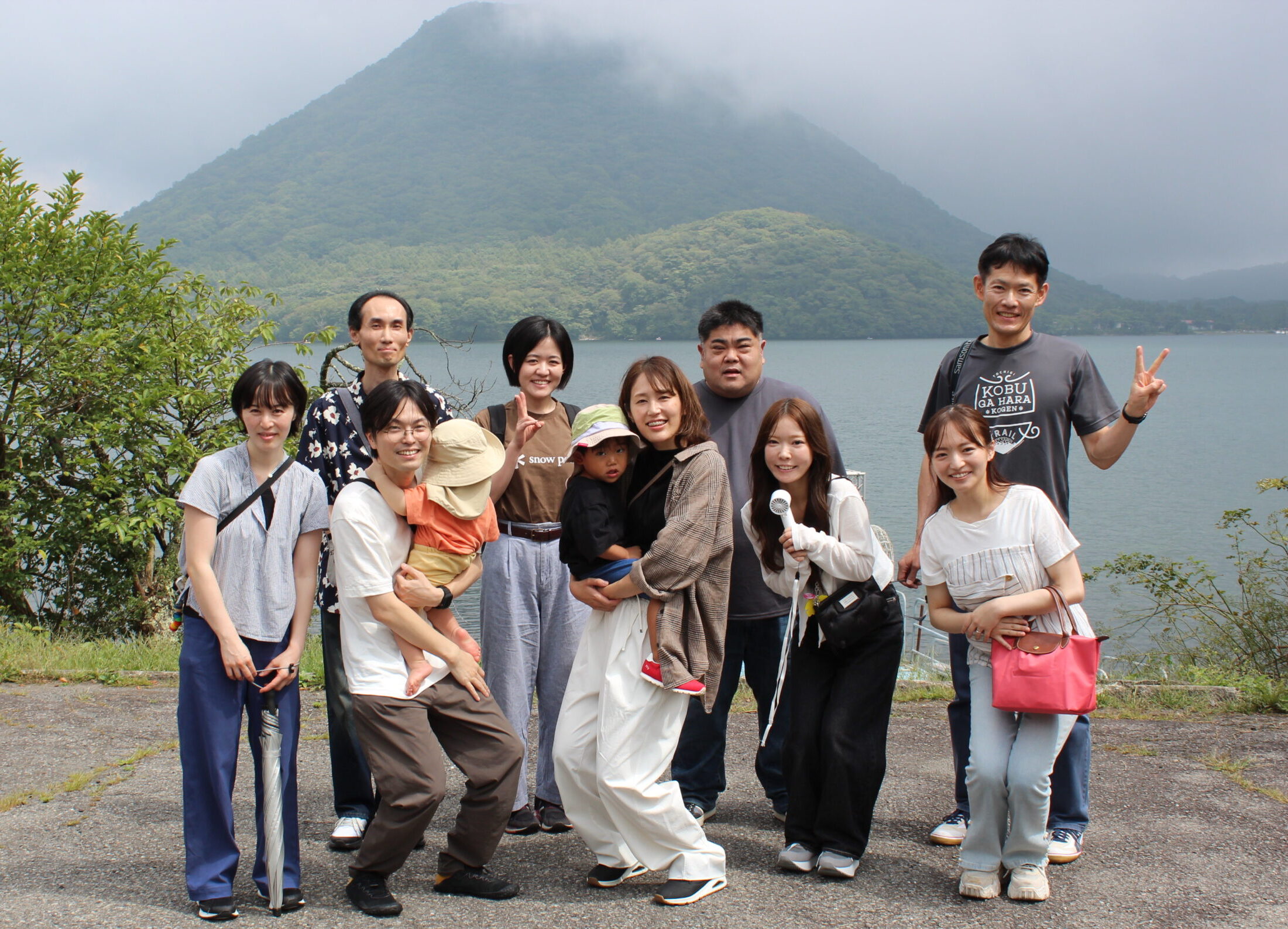 行き先は お隣 群馬県。初日は事務所を午前9:30に出発。まず榛名湖へ向かいました。ちょうど12時頃到着すると 参加者全員で記念撮影。そして、湖畔のレストハウスでランチ。名物のワカサギのフライ定食をいただきました。