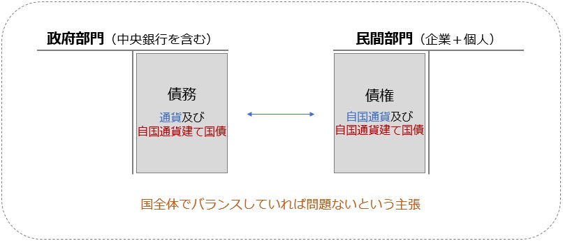 すなわち、中央銀行を含む「統合政府」の債務(通貨や国債)は、反対に、民間部門で債権となっており、国全体でバランスしている訳であるから問題ないという主張である。